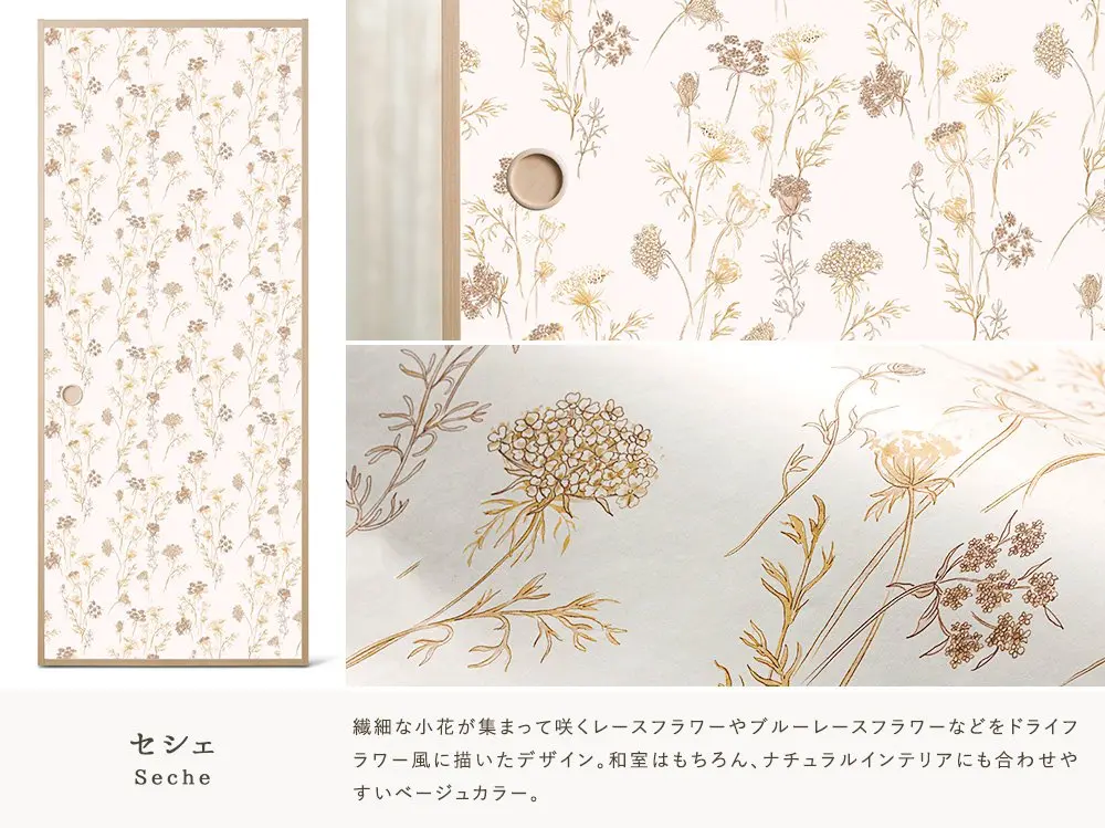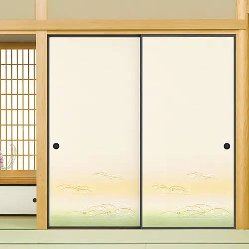 「襖紙」・襖の「縁(ふち)」・「引手(ひきて)」は伝統的な和のデザインからモダンな雰囲気のデザインまで様々な種類があります。手軽に部屋の雰囲気を変えることができるのが特徴です。