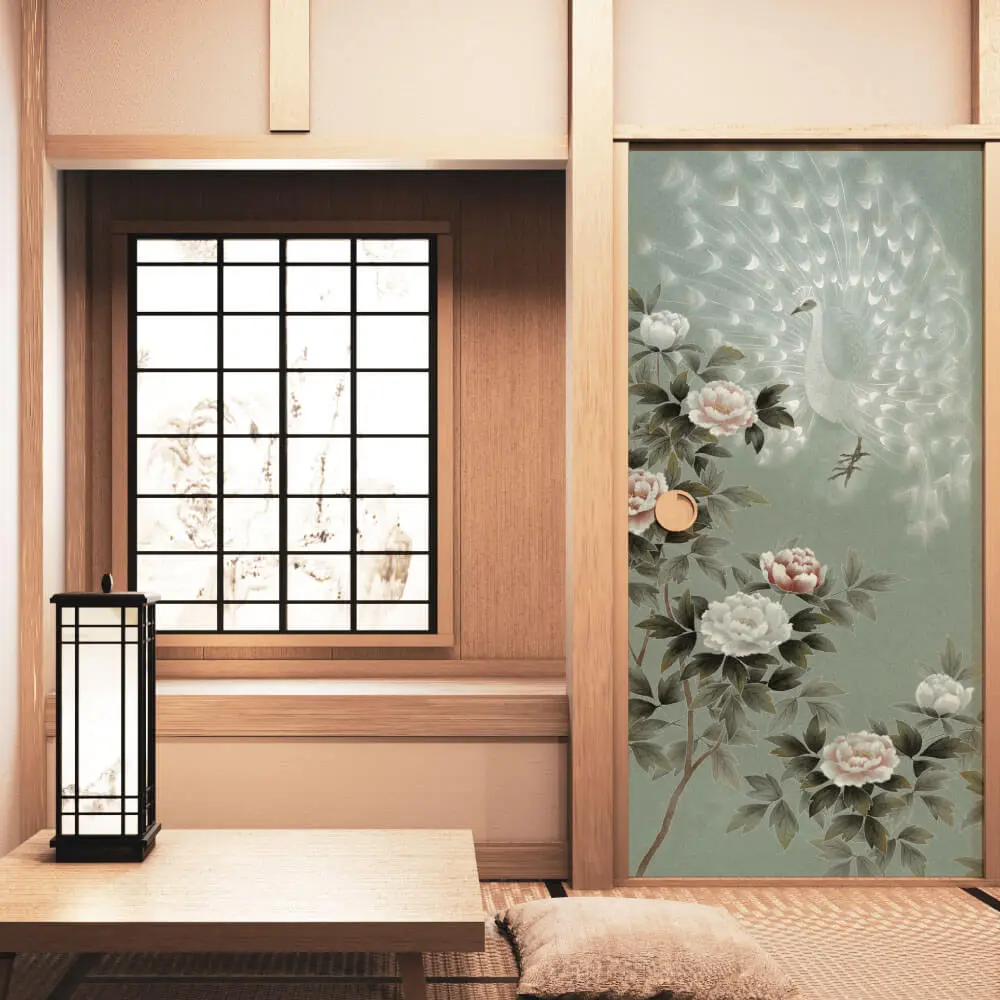 神々しい採光を放ち神聖なオーラを醸し出す白孔雀と、気品あふれる牡丹が優美な美しさを演出するデザインの襖紙になります。